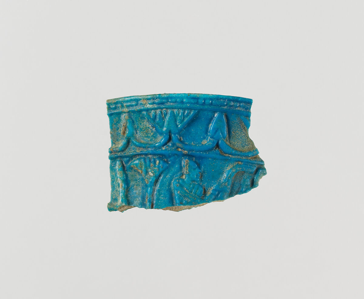 - Title: Chalice rim fragment with floral chain and scene of man in papyrus