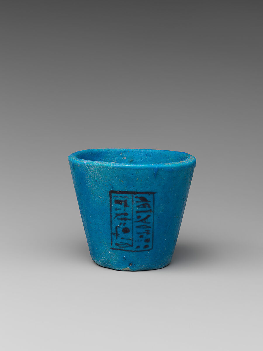This cup made of blue faience belonged to Nesikhonsu, the wife of the High Priest of Amun Pinedjem II. A hieroglyphic inscription names Nesikhonsu and gives her the title "Osiris, Great Leader of the First Music Troop of Amun" – a group of female musicians serving Amun-Re in his Karnak temple. It was one of 70 ritual cups that were used for libation rituals during Nesikhonsu’s funeral and buried within her tomb afterwards.