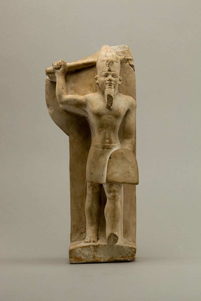 The statue depicts a male figure holds a shield while raising a swordlike mace to strike. This menacing pose often characterizes Syro-Palestinian gods in Egyptian art, but the gazelle’s head adorning the white crown suggests it is Reshef. This is the only known stone statue of Reshef to date, who otherwise mostly appears on seals, scarabs, and stelae.