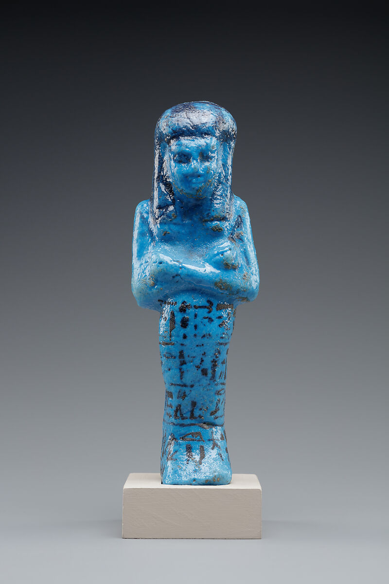 The funerary figures known as shabtis can be seen as avatars of the deceased. Some, like Isetemkheb's shabti here, are inscribed with part of Chapter 6 from the Book of the Dead, promising to act on behalf of her owner should she be called upon to perform manual labor in the afterlife. By the 21st Dynasty, as many as 401 shabtis (a worker for each day of the year plus an overseer for each 10-day week) could be included with burials. They were often placed in wooden boxes near their owner’s coffins. Worker shabtis can be identified by the farming tools they hold, whereas overseer shabtis typically wear a skirt and carry a whip.
