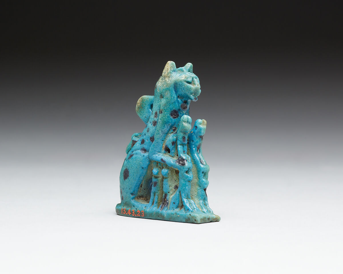 This figure is part of a repertoire of figures created in a distinctive spotted faience from dynasty 22 into dynasty 26. The center of production was the eastern Delta, in particular Bubastis and Tanis; this was an area where Near Eastern peoples had long been interwoven in the population; at this time it was also a center for the settlement of Libyan tribal peoples. Possibly these conditions influenced this particular production.