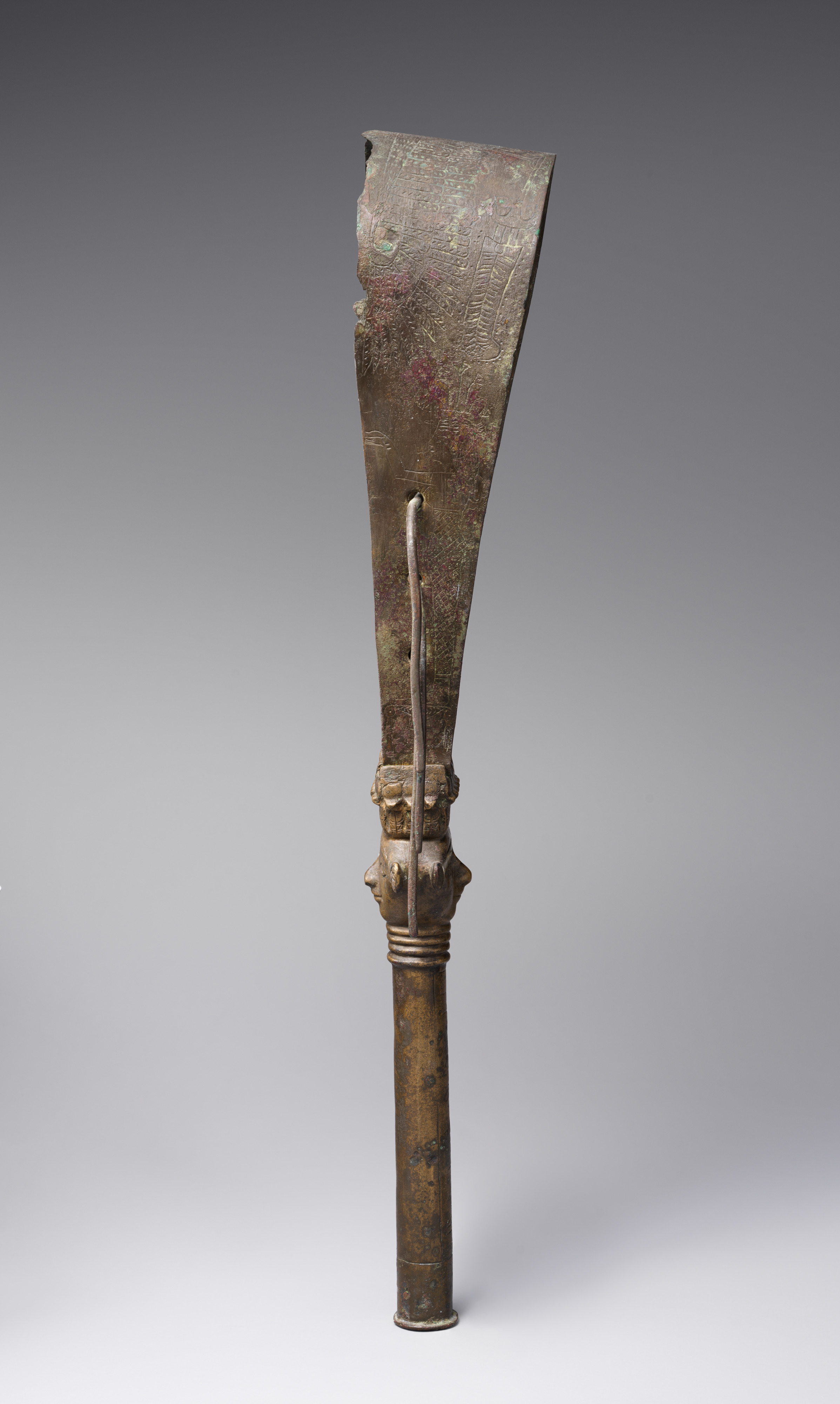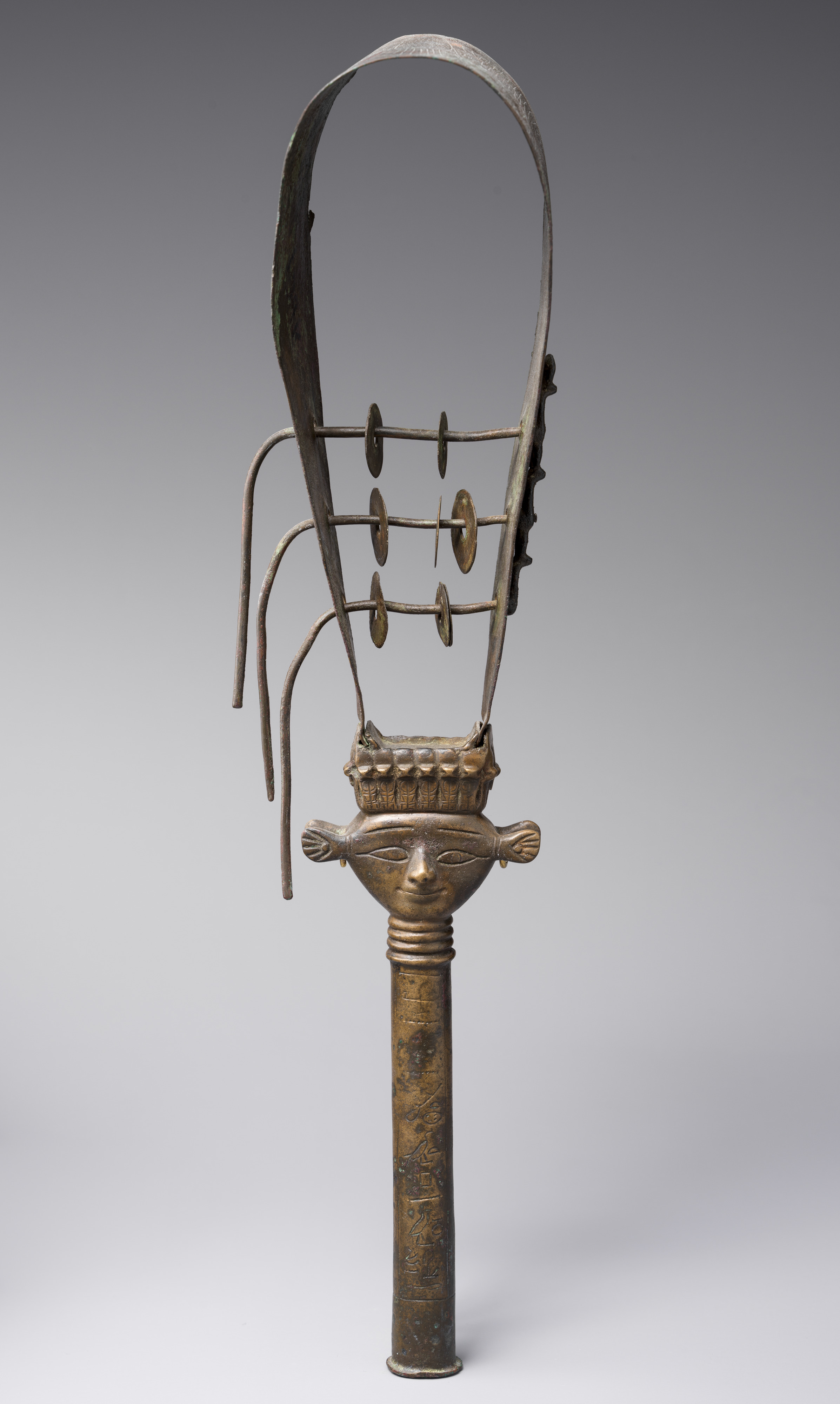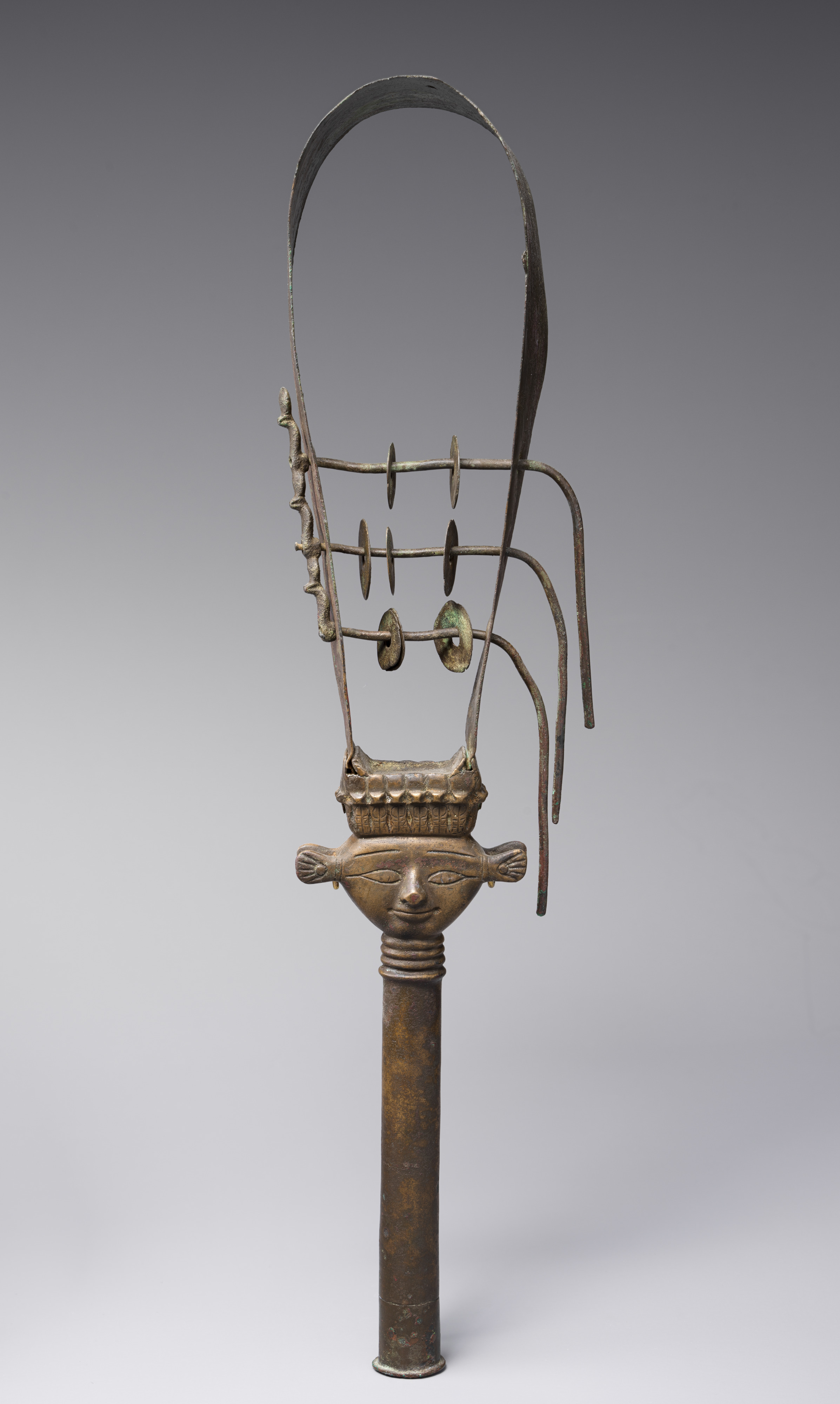 A sistrum is an ancient Egyptian percussion instrument that was shaken during religious ceremonies and when coming into the presence of a deity. It is thought to have imitated the sound of papyrus stalks being shaken, echoing an ancient rite connected with the myth in which the god Horus was raised in secret in a papyrus marsh. The handle of this sistrum is made in the form of the "Bat emblem" which was associated with the goddess Hathor, who was the patroness of music.