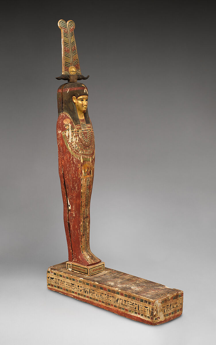 This hollow mummiform figure represents the mortuary deity Ptah-Sokar-Osiris. Dedicated to a musician of the god Nemty named Ihyt, it is inscribed with offering prayers and texts glorifying the gods. The figure was constructed in two halves, with six tenons used to fasten the lid to the box, and then set into a rectangular base. Most figures of this type have some sort of cavity that contains a roll of papyrus, a piece of cloth, or some sort of mummified material. The space inside this figure is very shallow: Found inside were grains of wheat and sand, and several fragmentary linen bundles containing mud (see 21.9.1d).