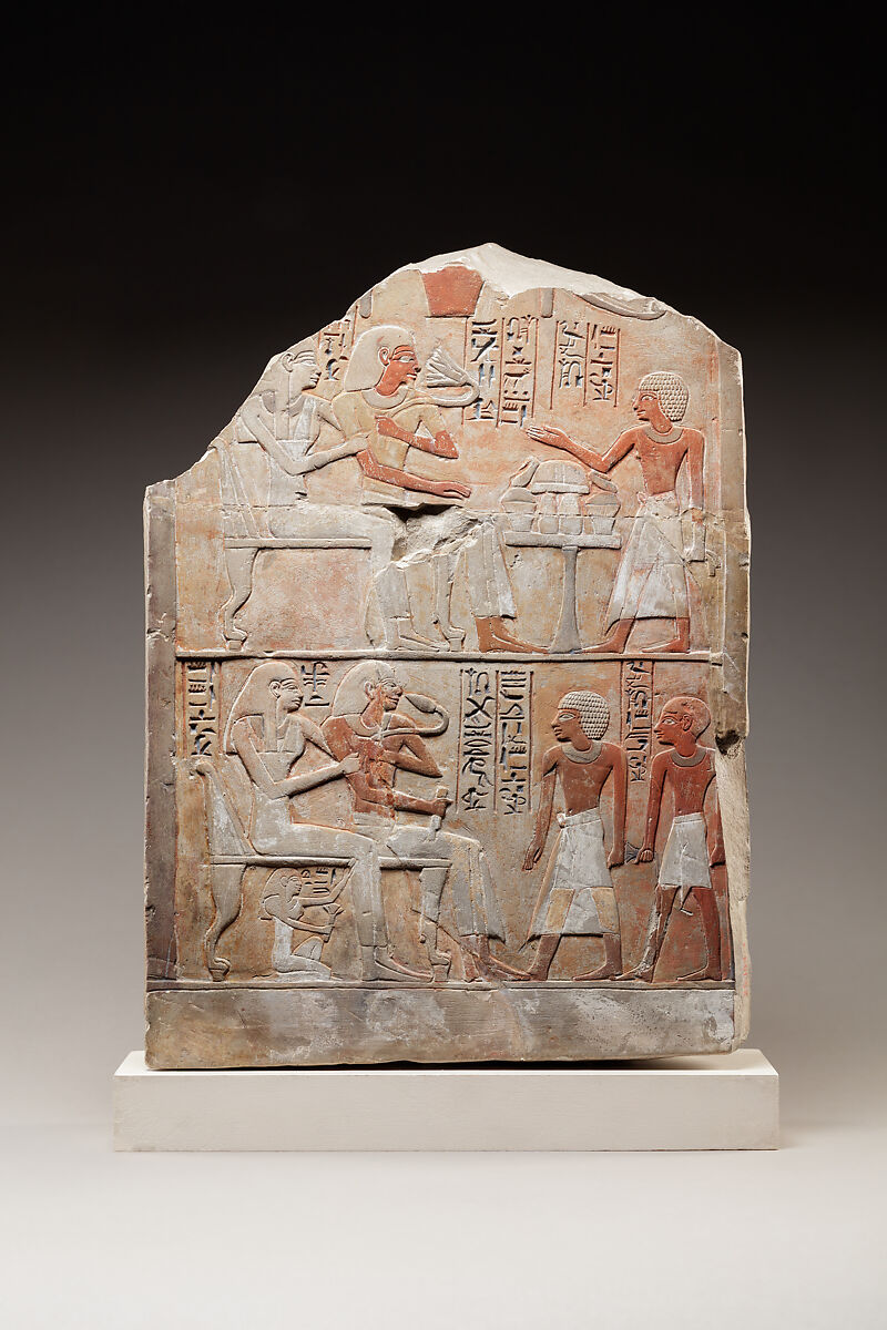 Painted limestone stela depicting Humay and his wife Senetnofret in the top register, with Pakhered and his wife Amenhotep seated in the register below. The officiating dedicator in both cases is a scribe named Amenhotep.