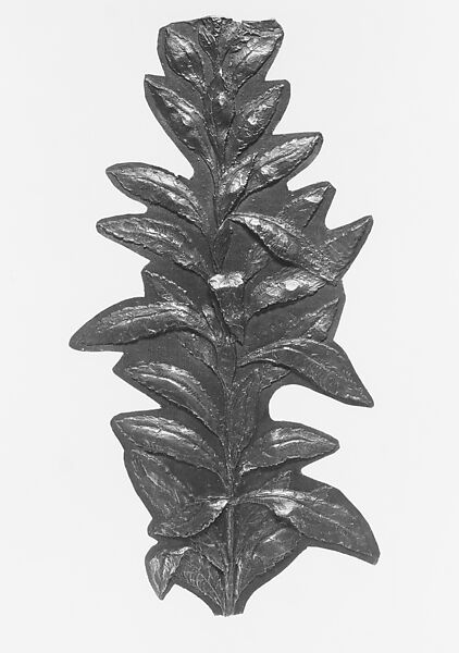 This flat, full-sized pattern is one of four, with 1985.191.1b–d, used to form the gold floral motifs applied on four sides of the Magnolia Vase, 99.2, also in the collection of the Museum. This pattern features a long section of serrated, elliptic leaves attached to a central stem.