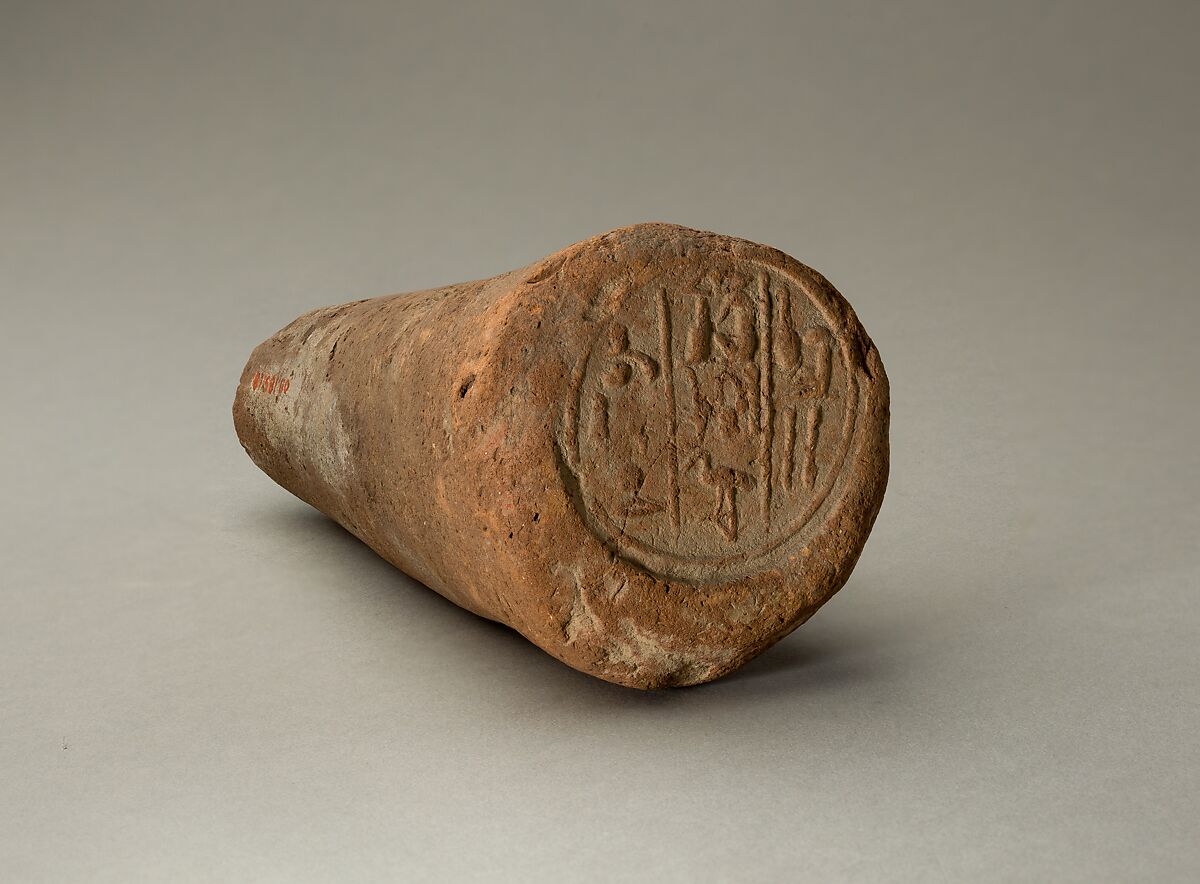 Used as architectural decoration, funerary cones were probably arranged in rows along the upper edge of private tomb facades. The cones were made of clay and the flat end was stamped with the name and titles of the tomb owner before the cone was fired. This cone was made for a royal scribe named Djehutynefer.