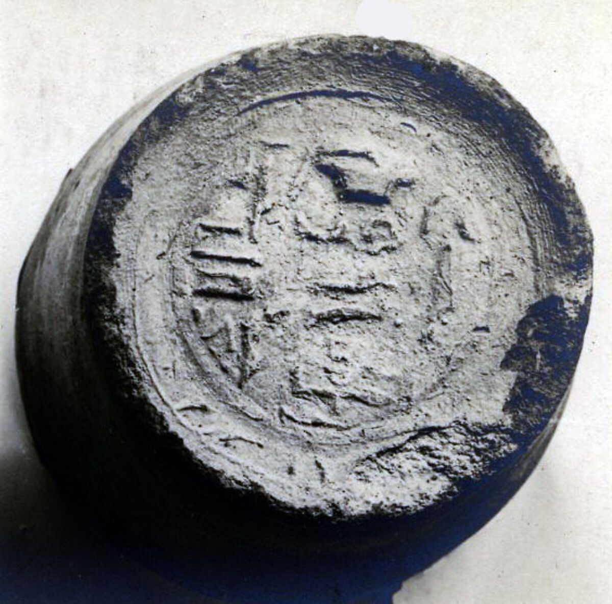 This cone and three others in the collection (15.2.67, .70; 30.6.61) have the impression of a seal inscribed for a man named Seshi who was overseer of the ships of the god Amun. Compared to other cones in the collection, these are larger in both diameter and length. They also differ in shape and manufacture. Whereas most funerary cones are solid and roughly conical in shape, these are hollow and become wider towards the middle before they taper to a blunt end. One example, 15.2.70, is preserved for its full length, but the best preserved impression is on cone 15.2.67.
