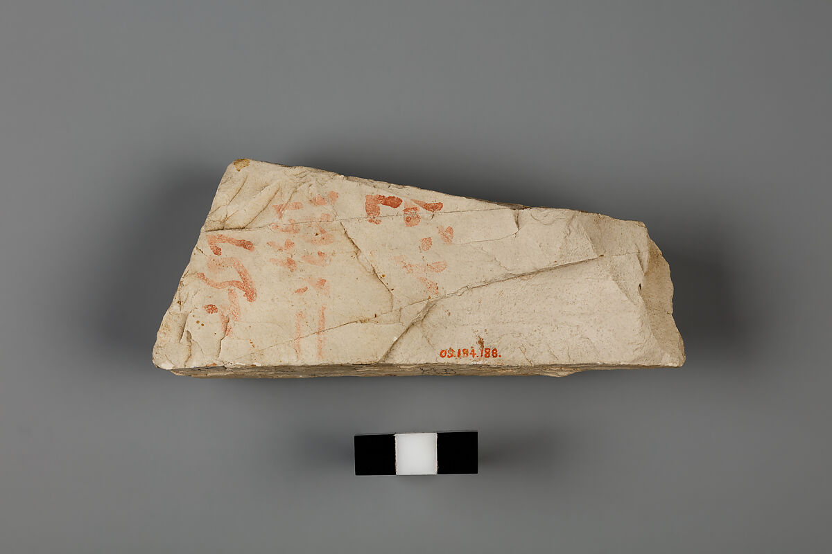 Ostraca (plural for ostracon) are potsherds used as surfaces on which to write or draw. The term is used, by extension, to refer to chips of limestone, which were employed for similar purposes. Despite their humble appearances, ostraca bear a wide range of images and texts, including administrative documents, literary texts, and depictions of royal and divine figures. The texts were mostly written with reed pen and ink of two colors, red and black, and inscribed in Hieratic, the cursive script of ancient Egypt throughout most of its periods. This ostracon bears unintelligible traces of a text written in red ink.