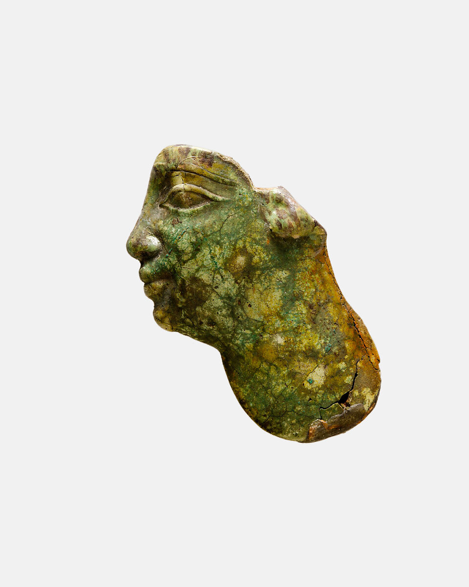 Glass figural inlay elements could be fitted in individual wooden cells, or placed immediately adjacent to other elements and attached to a background. This inlay was probably originally red, indicating a king or male god, but has degraded to green.