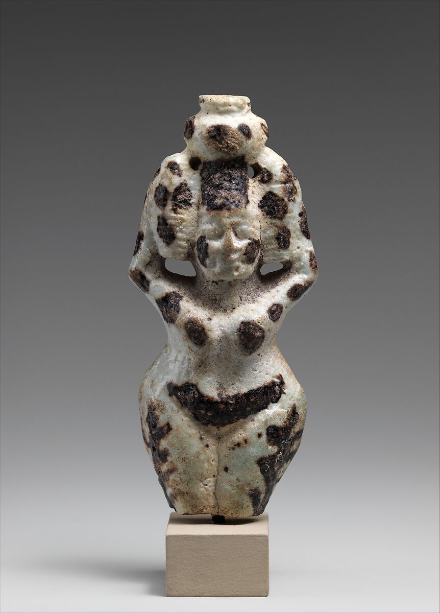 This figure is part of a repertoire of figures created in a distinctive spotted faience from dynasty 22 into dynasty 26. The center of production was the eastern Delta, in particular Bubastis and Tanis; this was an area where Near Eastern peoples had long been interwoven in the population; at this time it was also a center for the settlement of Libyan tribal peoples. Possibly these conditions influenced this particular production.