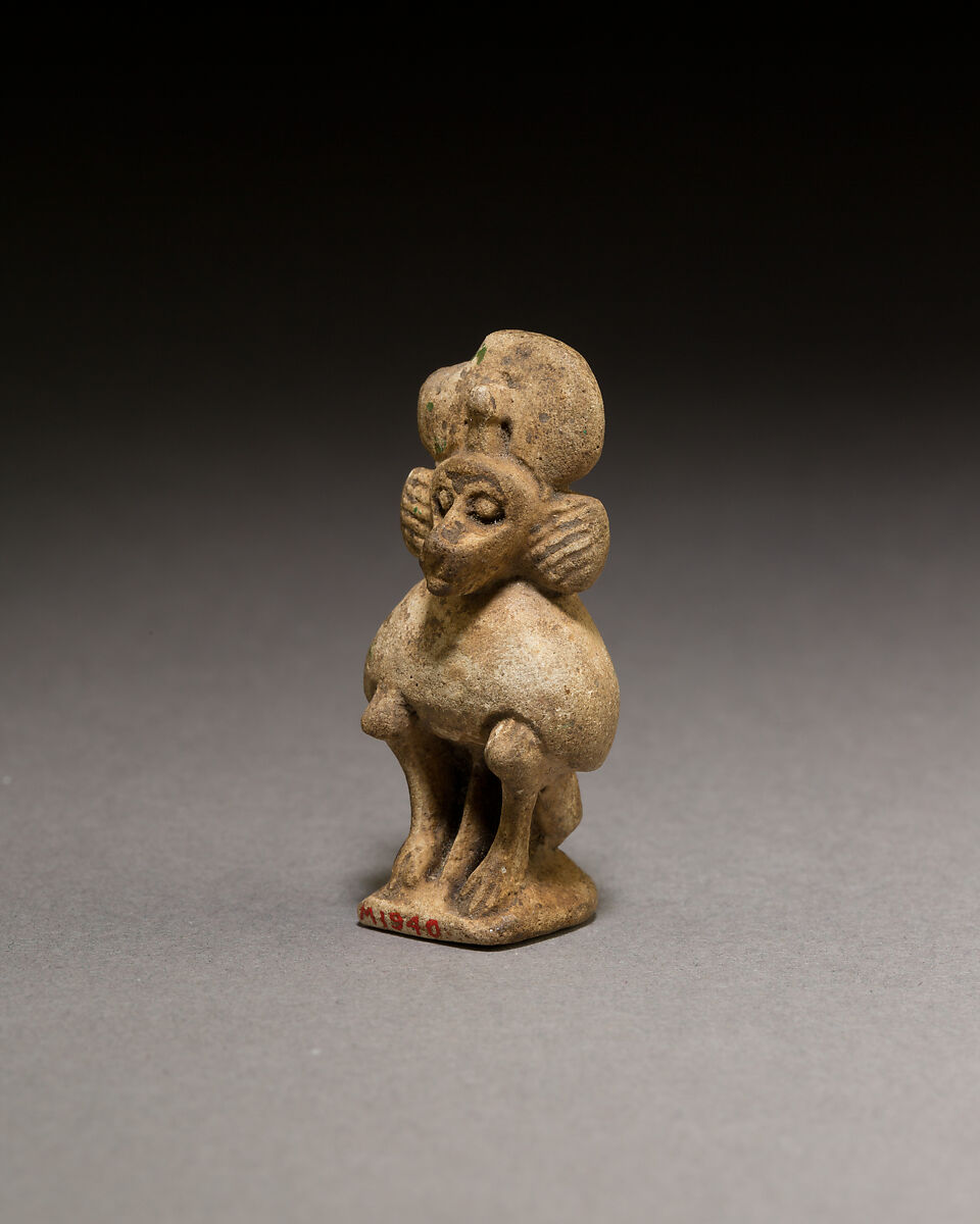 Thoth in the baboon form is here depicted with a small narrowing muzzle and particularly exuberant cheek manes. Somewhat unusually the god also has a uraeus on his disk. No horns are indicated in association with the disk. It is actually open to question whether a moon disk indicating Thoth or a sun disk indicating another aspect of the god or having some other import is represented.