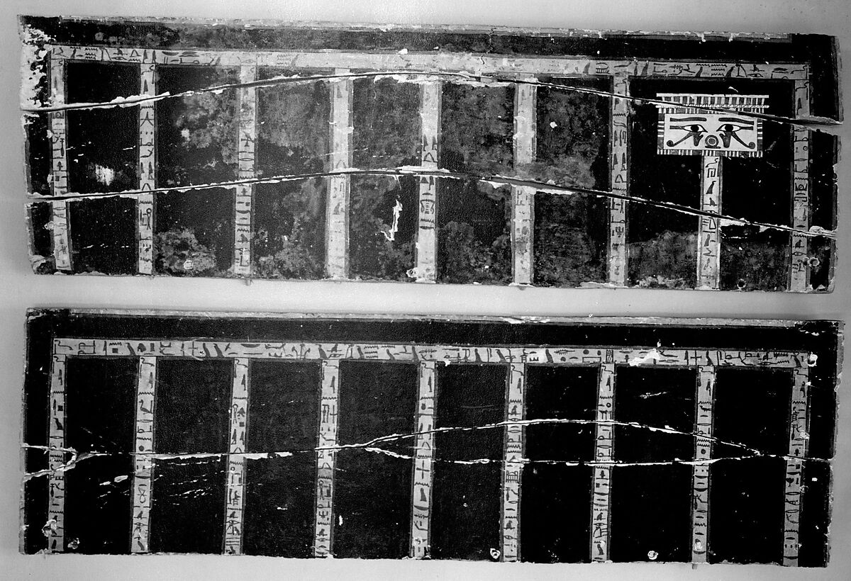The four black-painted coffins in gallery 109 are decorated with bands of inscription containing spells from the Coffin Texts. The eyes of Horus painted at the head end of the left side are enclosed in panels with a cavetto cornice on top. Two examples (31.3.429a, b; 31.3.430a, b) have a false door panel beneath the eyes, and a third (31.3.431) has a false door and a polychrome dado. On this coffin, which is inscribed for a priest named Nemtiemsaf "(the god) Nemti is his protection", the bands of inscription have a yellow background.
