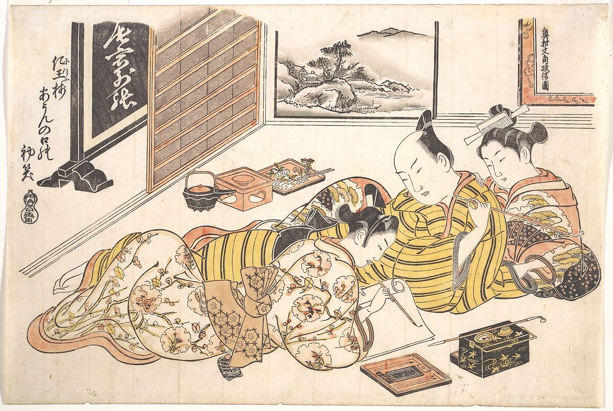 The artist’s signature appears in the corner of a screen to the upper right of the scene in which a wakashu (homosexual youth) competes with a courtesan for the attentions of a visitor to the Yoshiwara pleasure district. The opening scenes of erotic books tend to be less risqué than the subsequent images, and this one, the “First Month” from Pattern Book for the Boudoir, is indeed tamer than those for the other eleven months pictured in the book. A seventeen-syllable hokku poem accompanies each image. Here, the reference is to a special species of plum called Niō, alluding to the Guardian King figures that guard a temple gate. One of the sculptures opens its mouth to pronounce the mystical syllable “Aun”—but here it is linked to the playful custom of marking the first laughter or joke of the New Year.