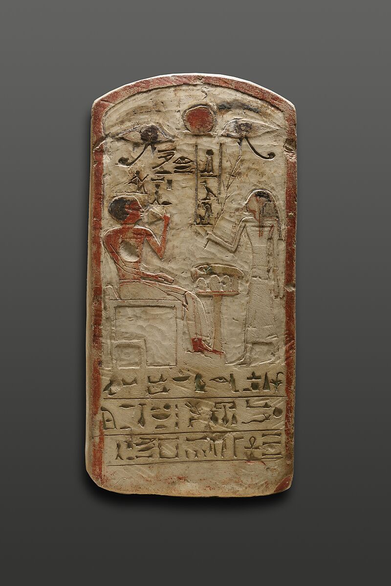 This round-topped stela with a solid red border is dedicated to a man named Merneptah. He is shown seated on a block seat, which resembles a throne often used by a king or a deity, rather than a more common four-legged chair. He is dressed in a long wraparound skirt, which the artist has rendered as a sheer garment in order to reveal the short kilt underneath. Merneptah holds a water lily blossom, a symbol of regeneration, up to his face. Immediately in front of his legs is a table laden with bread loaves and a bundle of green onions. A woman named Ina stands before him and holds up a branch, an unusual object in this context. Above the two figures are a pair of wedjat eyes and a shen sign, all of which have protective meanings. The three lines of inscription at the bottom of the stela include an offering formula that invokes the god Osiris.
