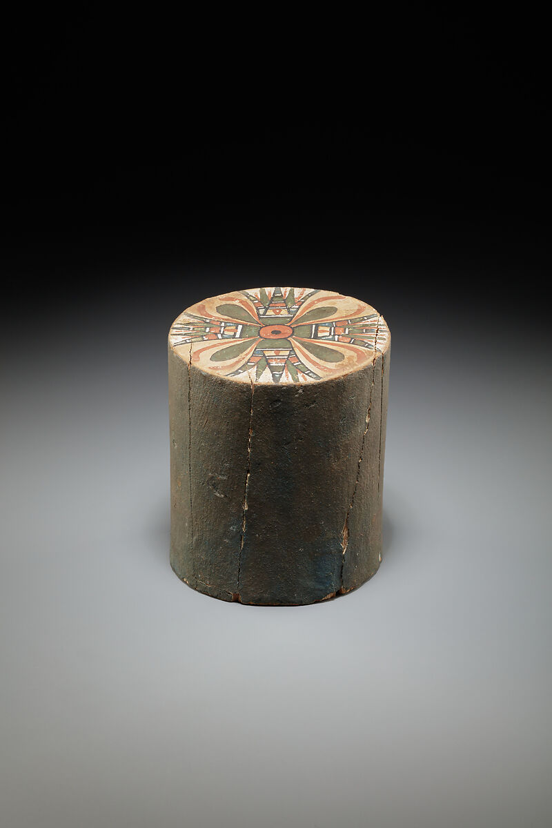 This object of painted wood has been identified as a “knob” that would have protruded from one of the short sides of the lid of a rectangular coffin and used to lower it into place during the funerary ceremonies. After the burial, the projecting part of the knob would have been sawn off, leaving a cylindrical shape, as can be seen on a number of Middle Kingdom coffins (see for example, 32.3.427. For a clear example of such a knob, belonging to the steward Wah and found in his tomb, see 20.3.202c.
