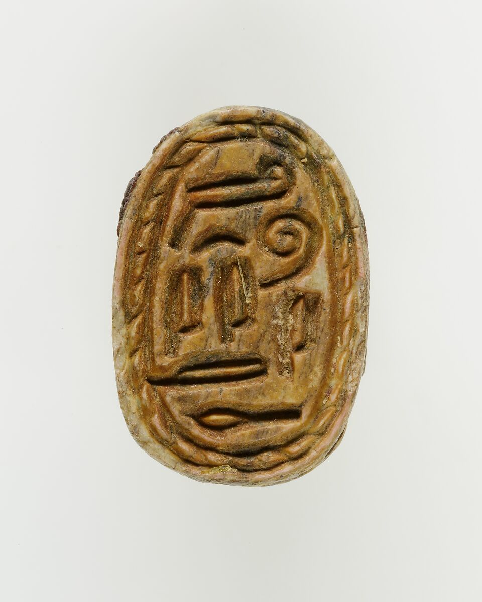 Administrative changes during Dynasty 12 lead to an increase in bureaucracy and, subsequently, in the production and use of seals. This is reflected in the beginning of the mass production of scarabs, the most popular shape for amulets, in late Dynasty 12 through Dynasty 13 (ca. 1850-1640 B.C.). Thousands of these late Middle Kingdom scarabs bear the names and titles of officials, who would wear them as amulets, but who could also use them to seal documents, containers or doors. However, the scarabs’ primary function remained that of a protective amulet. Several inscriptions add a funerary epithet to the owner’s name, indicating that the amulet was manufactured after the owner had passed away.