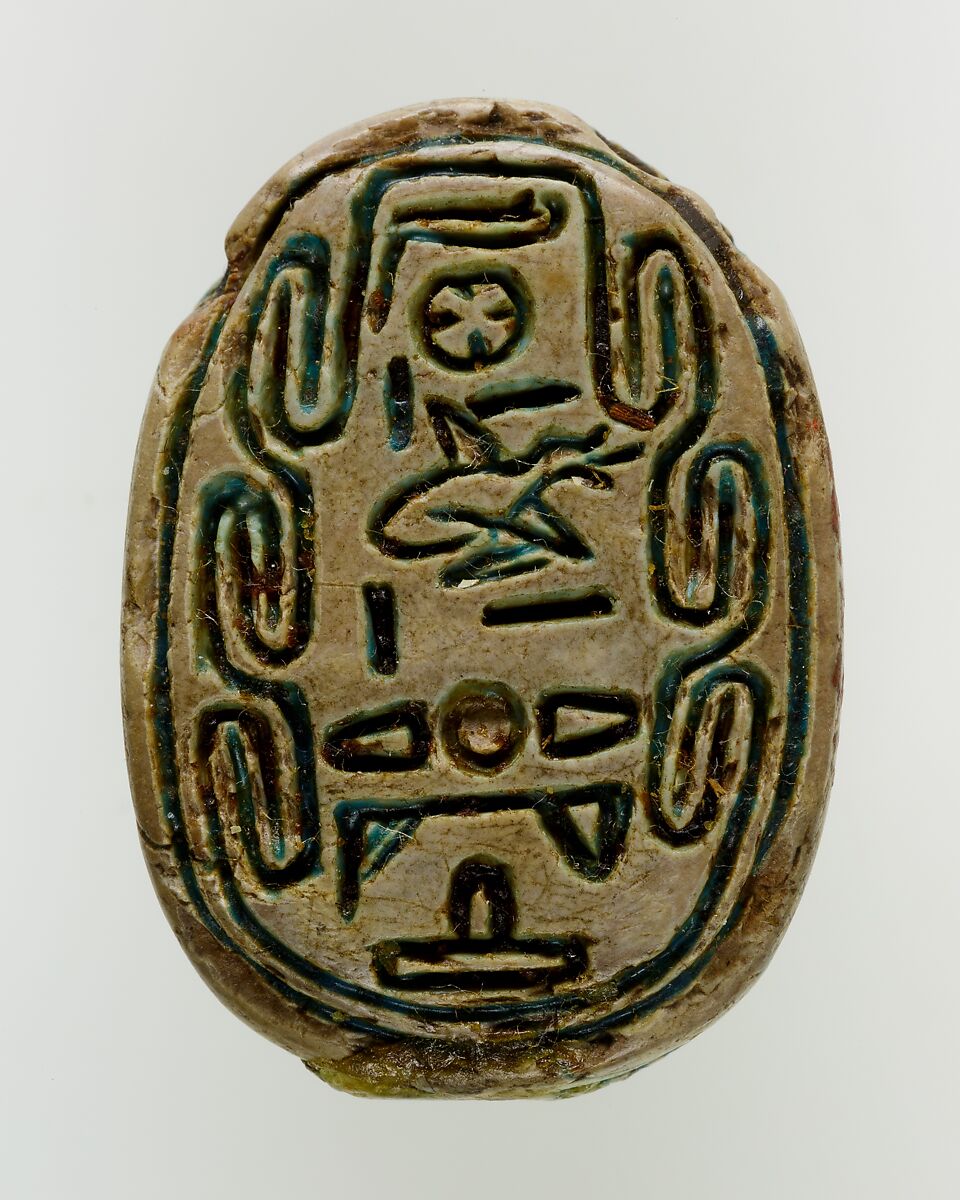 Administrative changes during Dynasty 12 lead to an increase in bureaucracy and, subsequently, in the production and use of seals. This is reflected in the beginning of the mass production of scarabs, the most popular shape for amulets, in late Dynasty 12 through Dynasty 13 (ca. 1850-1640 B.C.). Thousands of these late Middle Kingdom scarabs bear the names and titles of officials, who would wear them as amulets, but who could also use them to seal documents, containers or doors. However, the scarabs’ primary function remained that of a protective amulet. Several inscriptions add a funerary epithet to the owner’s name, indicating that the amulet was manufactured after the owner had passed away.