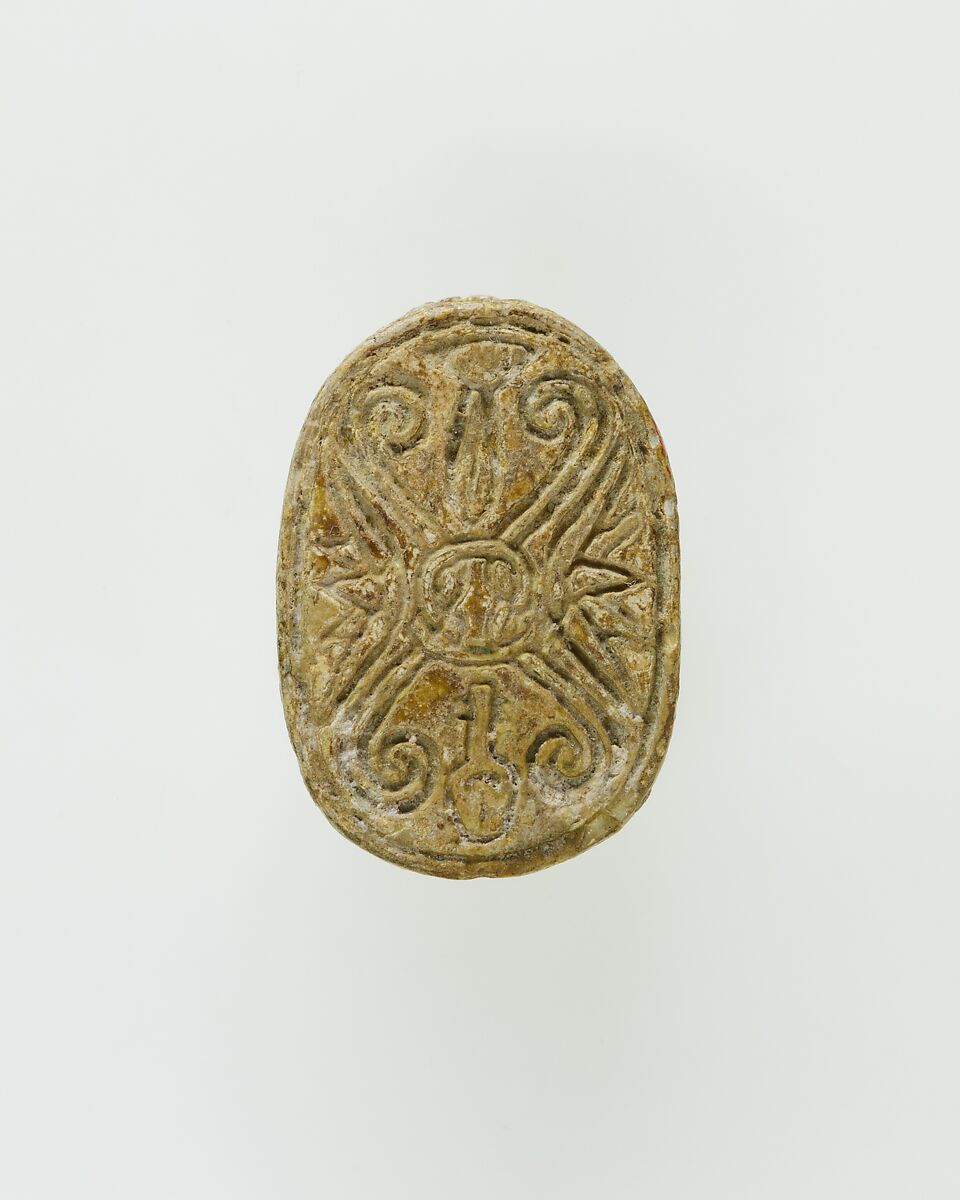 The underside of the scarab is finely decorated with a cross design consisting of scrolls centered on convoluted coils. Coil designs are not often combined with cruciform patterns; this is a rare and elaborate example dating to the late Middle Kingdom (late Dynasty 12–Dynasty 13, ca. 1850–1640 B.C.). Hieroglyphs associated with positive ideas such as life and regeneration, namely lotus flowers, the papyrus stem, and the hieroglyph for good and beautiful (nefer), are placed between the scrolls.
