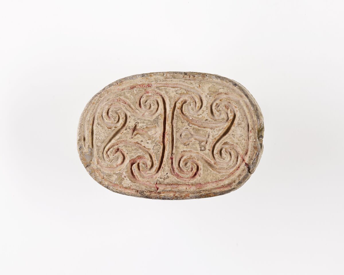 The majority of design scarabs of the late Middle Kingdom (late Dynasty 12–Dynasty 13, ca. 1850–1640 B.C.) are incised with symmetric compositions of protective hieroglyphs and/or scrolls.