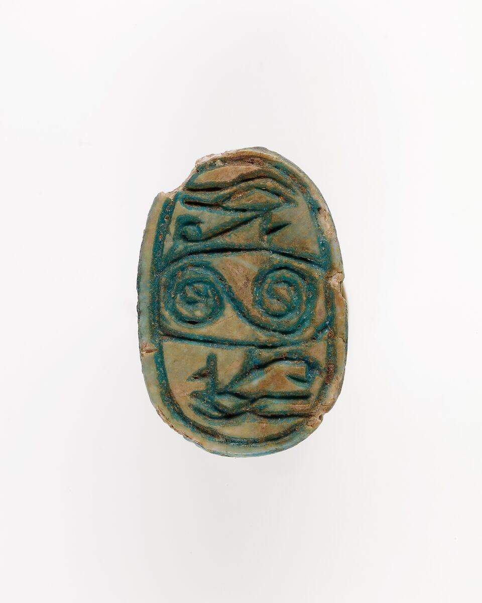 This scarab shows wedjat-eyes on either side of a scroll. As the healed eye of Horus, the wedjat is a powerful symbol, representing health and regeneration.