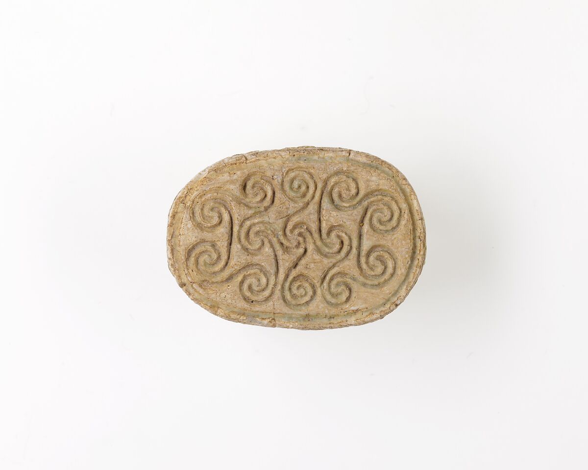 Scrolls and spirals –whether single or interlocking, or in combination with hieroglyphs or floral motifs– already decorate the earliest types of scarabs and are common throughout the first half of the second millennium B.C. While their meaning and source of inspiration remains unknown, scroll designs are also appealing to the eye. A wide variety of combinations, some of which more complex than others, is found on Egyptian scarabs of the Middle Kingdom and scrolls become particularly popular during late Dynasty 12 and Dynasty 13 (ca. 1850–1640 B.C.). While these designs continue to appear on scarabs in the Second Intermediate Period (ca. 1640–1550 B.C.) and on contemporary Canaanite imitations, details in the composition or on the scarab’s back or its legs allow the seal-amulet to be more precisely dated.