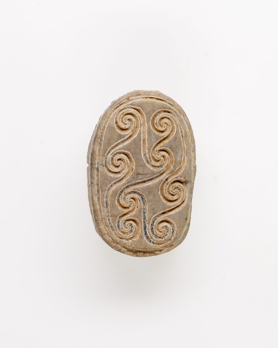 Scrolls and spirals –whether single or interlocking, or in combination with hieroglyphs or floral motifs– already decorate the earliest types of scarabs and are common throughout the first half of the second millennium B.C. While their meaning and source of inspiration remains unknown, scroll designs are also appealing to the eye. A wide variety of combinations, some of which more complex than others, is found on Egyptian scarabs of the Middle Kingdom and scrolls become particularly popular during late Dynasty 12 and Dynasty 13 (ca. 1850–1640 B.C.). While these designs continue to appear on scarabs in the Second Intermediate Period (ca. 1640–1550 B.C.) and on contemporary Canaanite imitations, details in the composition or on the scarab’s back or its legs allow the seal-amulet to be more precisely dated.
