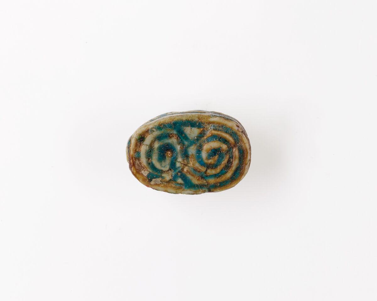 Scrolls and spirals –whether single or interlocking, or in combination with hieroglyphs or floral motifs– already decorate the earliest types of scarabs and are common throughout the first half of the second millennium B.C. While their meaning and source of inspiration remains unknown, scroll designs are also appealing to the eye. A wide variety of combinations, some of which more complex than others, is found on Egyptian scarabs of the Middle Kingdom and scrolls become particularly popular during late Dynasty 12 and Dynasty 13 (ca. 1850–1640 B.C.). While these designs continue to appear on scarabs in the Second Intermediate Period (ca. 1640–1550 B.C.) and on contemporary Canaanite imitations, details in the composition or on the scarab’s back or its legs allow the seal-amulet to be more precisely dated.