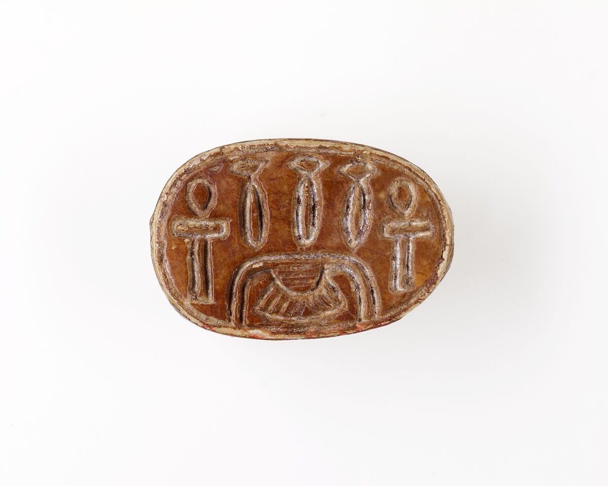 The majority of design scarabs of the late Middle Kingdom (late Dynasty 12–Dynasty 13, ca. 1850 –1640 B.C.) are decorated with symmetric compositions of hieroglyphs and/or scrolls. These signs are not meant to form words but are chosen for their positive, protective meaning. This scarab shows the hieroglyph for gold (nub) and signs placed above it, in pairs to form a balanced composition.
