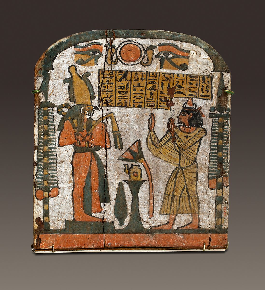 This is one of four stelae found near the doorway of the brick chapel of the family of Saiah, a wab, or purification priest of Amun who lived during the latter half of the 22nd Dynasty. The original tomb in whose courtyard this chapel was built dates to the 11th Dynasty, over a millennium earlier. All of the stelae are made of wood, painted in green, red, yellow and black on a white gesso ground.