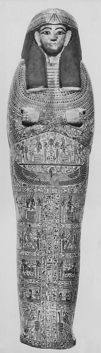 The coffin set of the General's Charioteer, Itamun (an outer coffin (26.3.1a, b), this inner coffin, and a mummy board (26.3.3)) was found in a reused tomb in a valley south of Deir el-Bahari. Itamun's outer coffin was not completely closed, as this coffin, made originally for a priest and copper engraver of the temple named Nesiamun, was slightly too large.