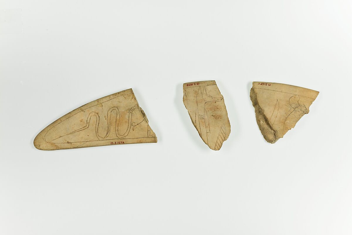 The three fragments of this magical wand were found in shaft tomb 466 at Lisht North. In the same thoroughly plundered shaft system was also found a statuette, now in the Egyptian Museum, Cairo (JE 45245, published Bulletin of the Metropolitan Museum of Art 10, October 1914, p. 200 with fig. 8 on p. 217). This statuette can be dated on the evidence of its inscription to Dynasty 13, and some pottery vessels from the same shaft are from the same late Middle Kingdom period. Two kohl jars (for one of them see 22.1.849), however, also from the same shaft system are of early 12th dynasty date. These may either be heirlooms included in the late Middle Kingdom burials, or burials in the shaft system, which comprised three chambers, extended over a considerable time. Since all objects were discovered scattered throughout the debris filling the shaft and chambers, it can no longer be determined whether the the magical wand was originally associated with the statuette or the kohl pots and its date is, therefore, not entirely certain.