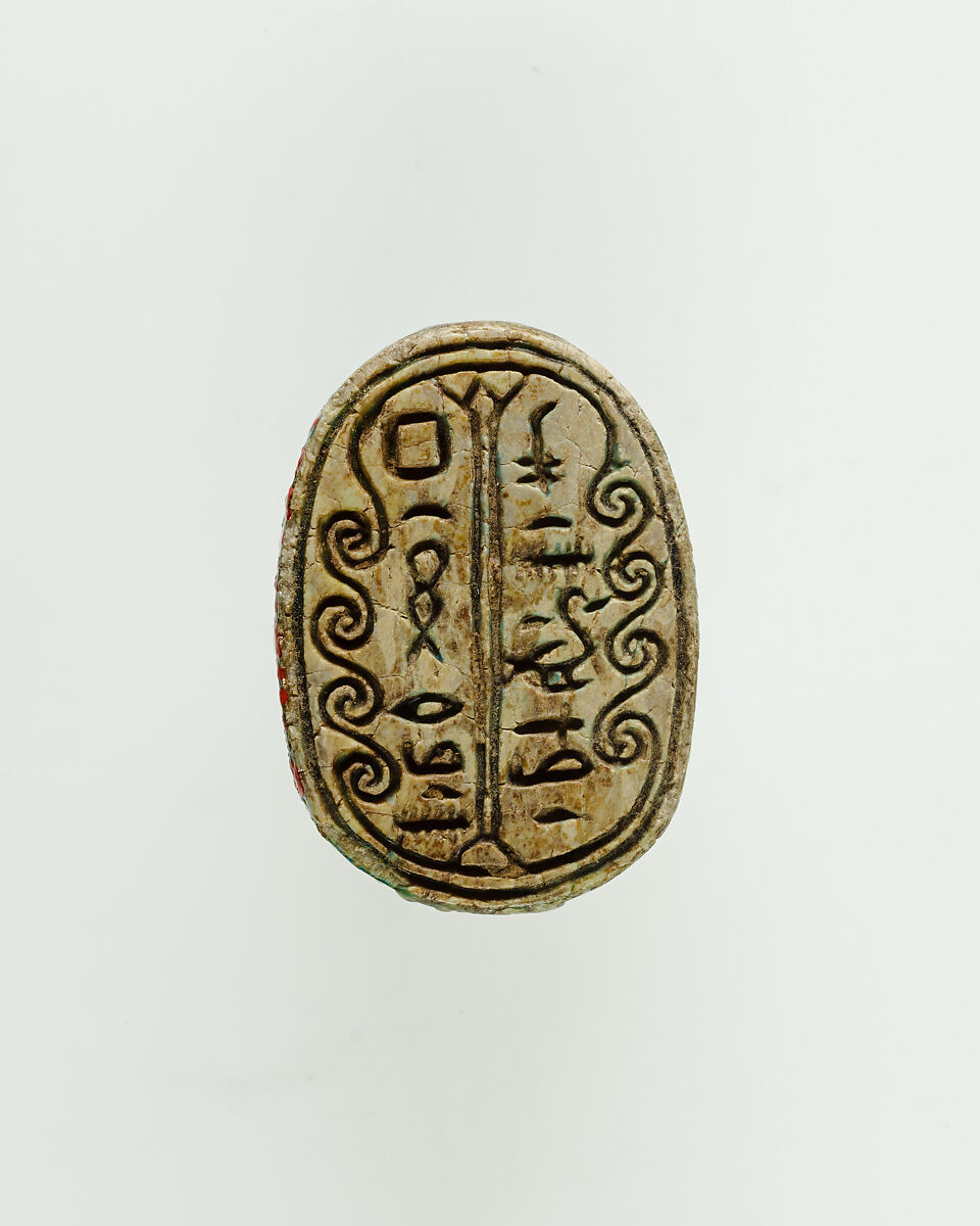 This scarab is inscribed with the name and royal titles of princess Redenptah (Dynasty 13). The inscription is surrounded by a border of interlocking scrolls and divided by a lotus flower.