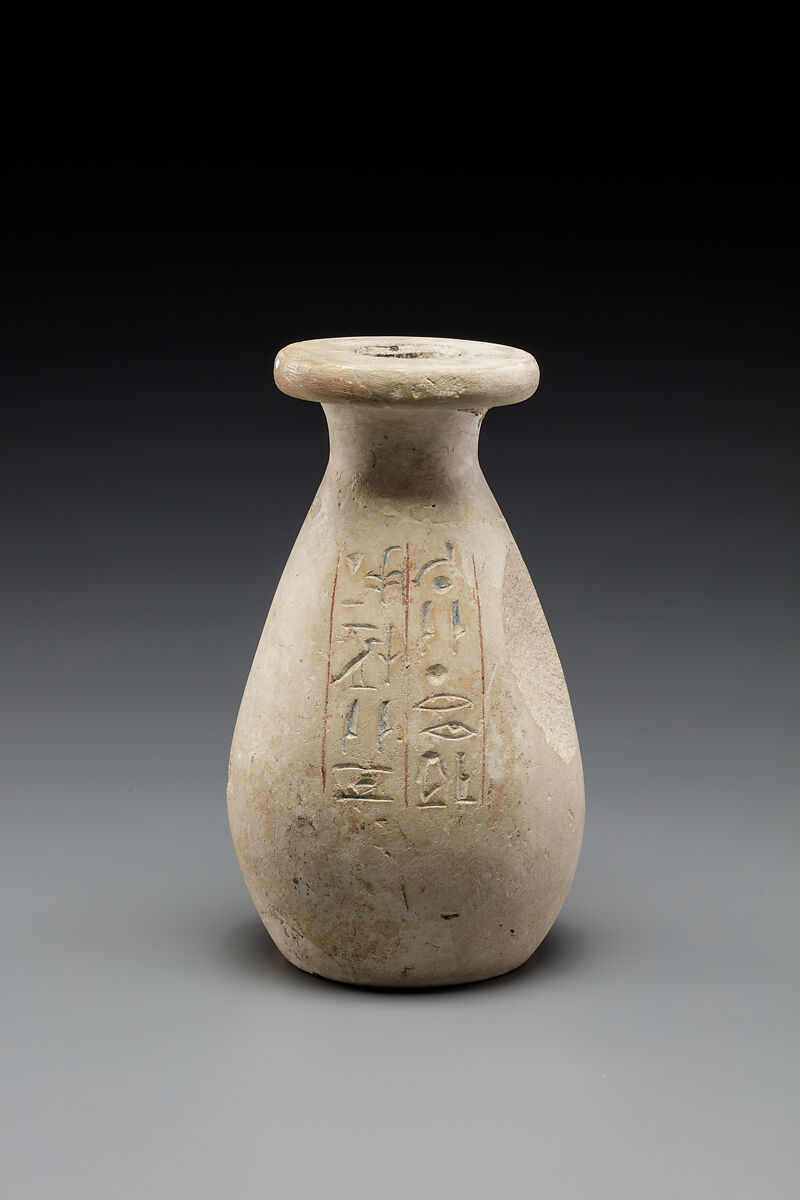 This jar is a model made of solid stone that was intended as a piece of burial equipment. The inscription names the Royal Nurse Senetnay who lived into the reign of her nursling, Amenhotep II. As wet-nurse of a king, she was granted burial in the royal cemetery now called the Valley of the Kings. The tomb originally intended for Senetnay is unknown, but some of her funerary equipment, including this jar and several others in the collection, was discovered in an unused royal tomb, KV 42, in 1900. Burial equipment inscribed for other non-royal individuals was also found in KV 42 and it is likely that the contents of a number of robbed tombs had been reburied here for safe-keeping in ancient times.