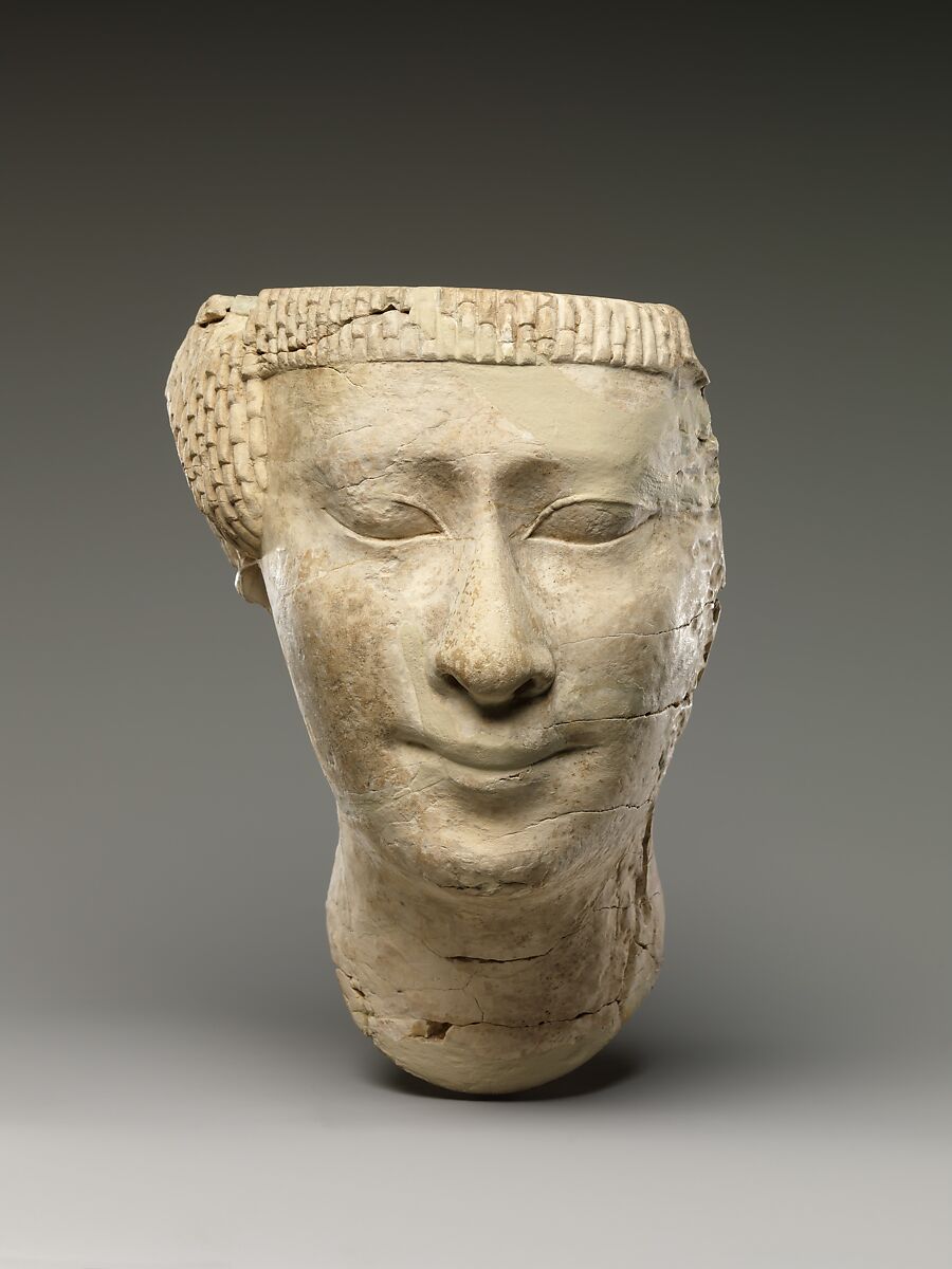 The identity of the female with the elaborate bobbed hairstyle, her head terminating prematurely just above the brow - is puzzling. There is no named figure or deity with whom she can be associated, although the figure type may have precursors among female figurines of the Third Intermediate Period and Late Period.
