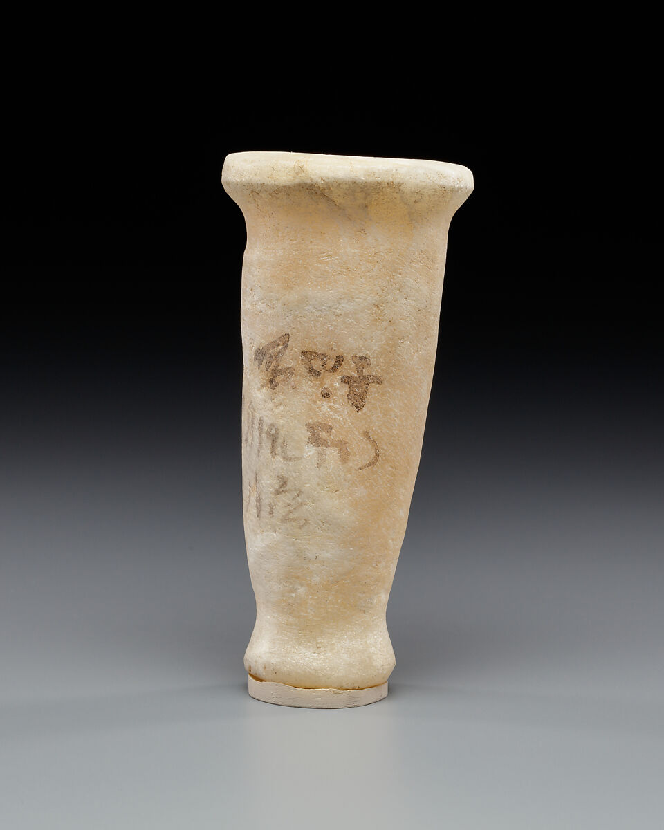 This model ointment is from one of the foundation deposits that were placed in front of the entrance of KV 42 in the Valley of the Kings. The inscription identifies the tomb's owner as Queen Hatshepsut-Merytre, principal wife of Thutmose III, whose tomb was located nearby. The inscription painted on the side begins with the title King's Great Wife (principal queen) followed by her name, bracketed by an abbreviated cartouche, and ends with the standard funerary epithet "true of voice" (justified). Another model ointment jar and a model dish from the KV 42 foundation deposits are also in the collection.