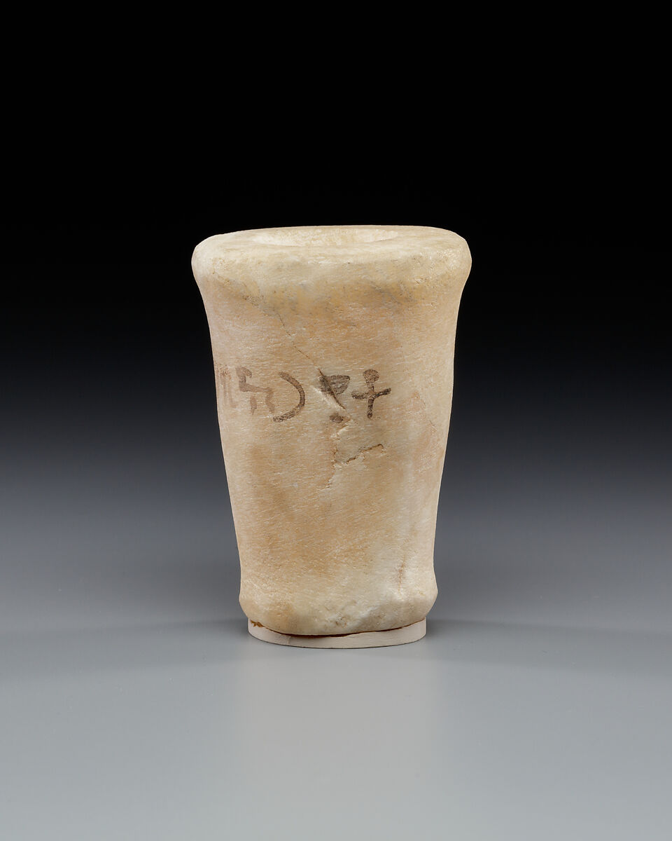 This model ointment is from one of the foundation deposits that were placed in front of the entrance of KV 42 in the Valley of the Kings. The inscription identifies the tomb's owner as Queen Hatshepsut-Merytre, principal wife of Thutmose III, whose tomb was located nearby. The inscription painted on the side begins with the title King's Great Wife (principal queen) followed by her name, bracketed by an abbreviated cartouche, and ends with the statement "May She Live". Another model ointment jar and a model dish from the KV 42 foundation deposits are also in the collection.