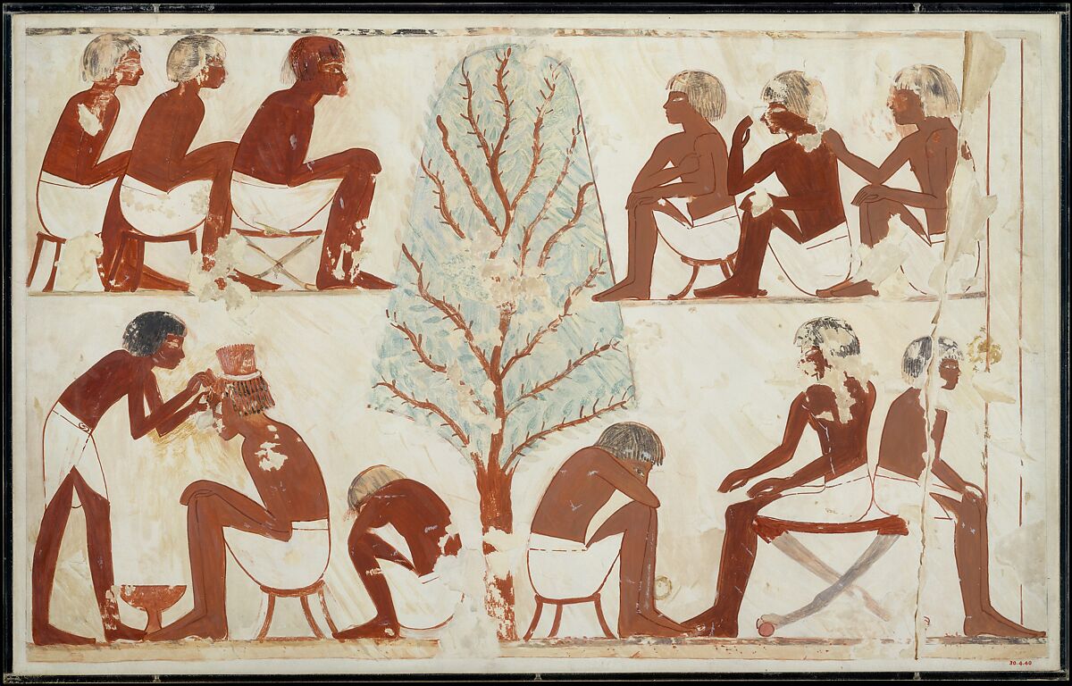 This facsimile painting copies part of a scene in the tomb of Userhat (TT 56) at Thebes. This vignette depicts men waiting their turn to have their hair cut by the barber who is at work in the lower left. The facsimile was painted at the tomb in 1925-1926 by Nina deGaris Davis who was a member of the Graphic Section of the Museum's Egyptian Expedition.
