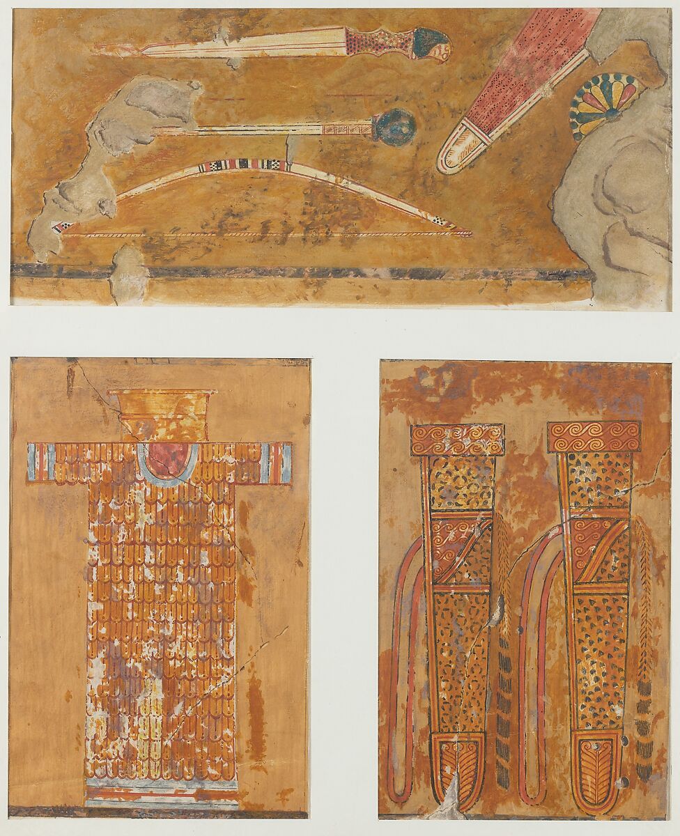 The new year was a time of renewal, and many New Year gifts depicted in New Kingdom tombs feature new gear for the king, such as items of warfare. The objects here, copied from the tomb of Qenamun, include a bow, whip, dagger (top), shirt of chain mail (bottom left), and two quivers (bottom right).