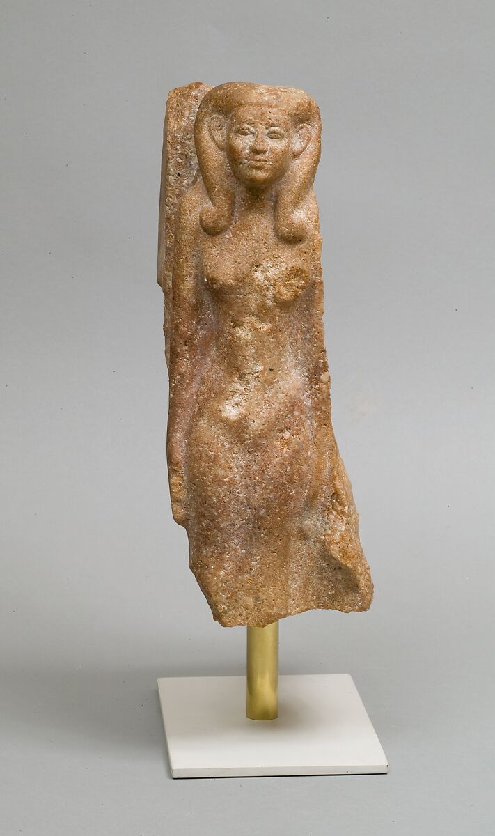 The woman stands, wearing a close-fitting sheath dress, with the front parts of her wig ending over her breasts in two large curls, a hair style often associated with the goddess Hathor.