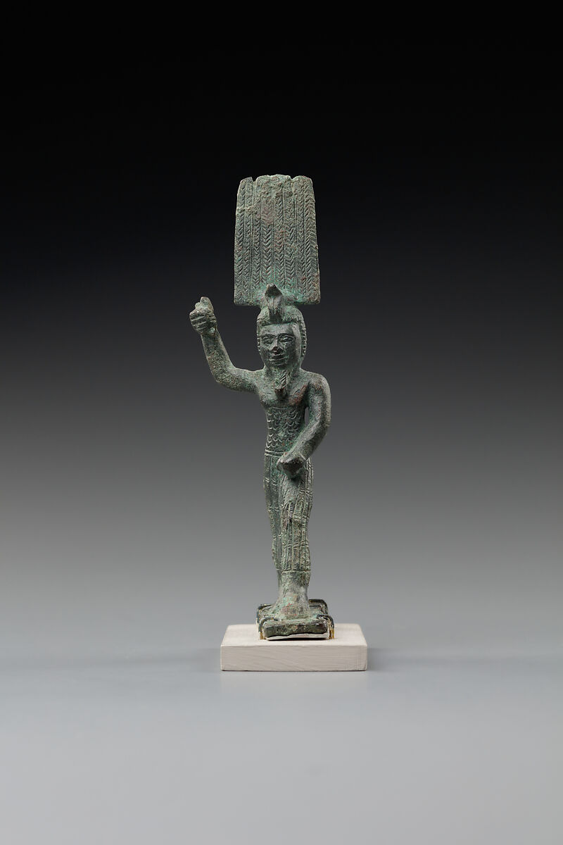 Onuris is depicted here, recognizable by his short hair and distinctive garment, which comprises a long patterned kilt, in this case combined with a finely detailed feathered or scaled cuirass. His crown comprises four tall feathers, represented flat and side-by-side, and he has a triple-strap suspension loop on the back. Onuris was a fierce god, known for capturing enemies in battle or hunting dangerous animals. His right arm is raised in the act of spearing a defeated enemy or animal, or holding a rope, which presumably he used to snare his prey. In this role, he personified good conquering and controlling forces of chaos and disruption.