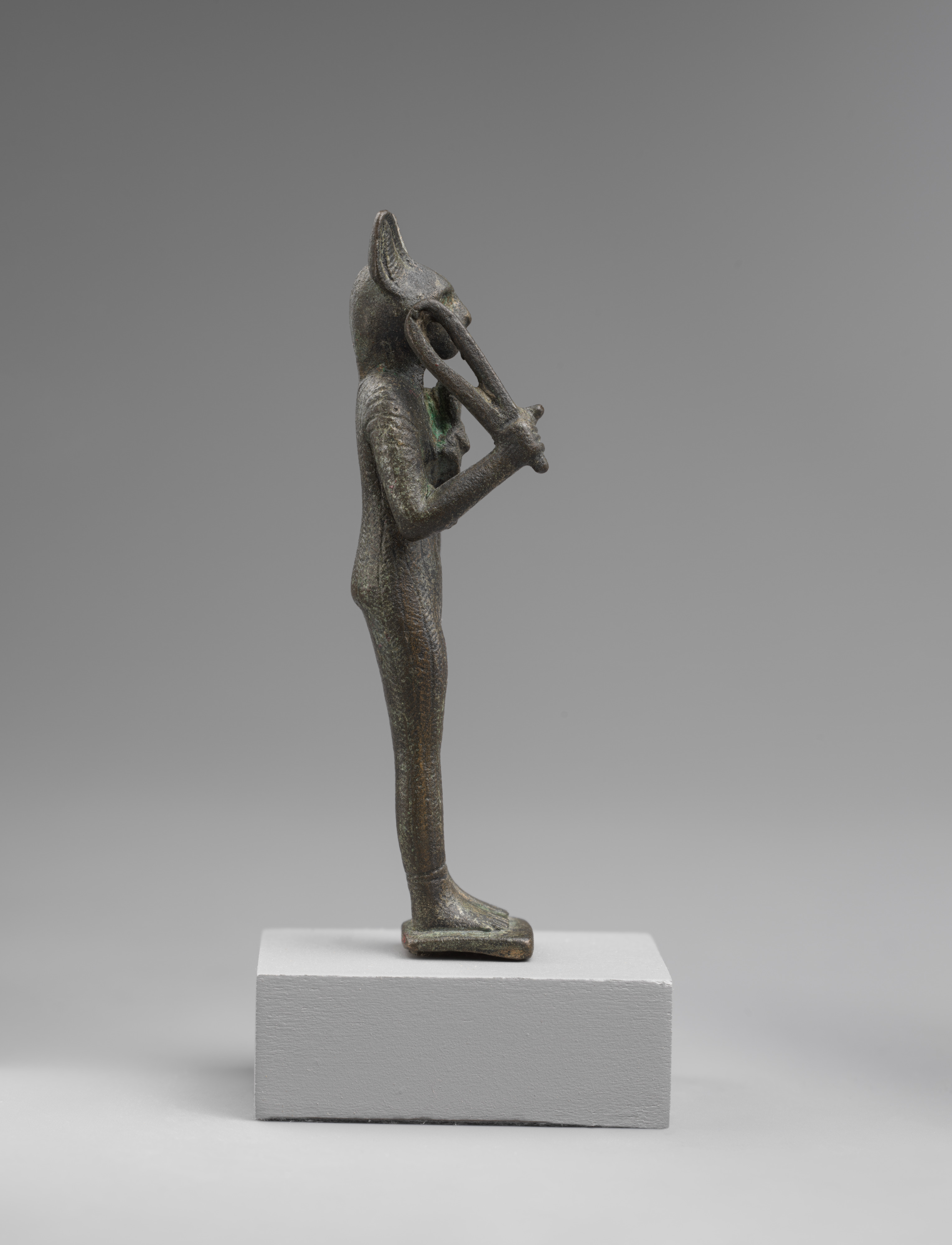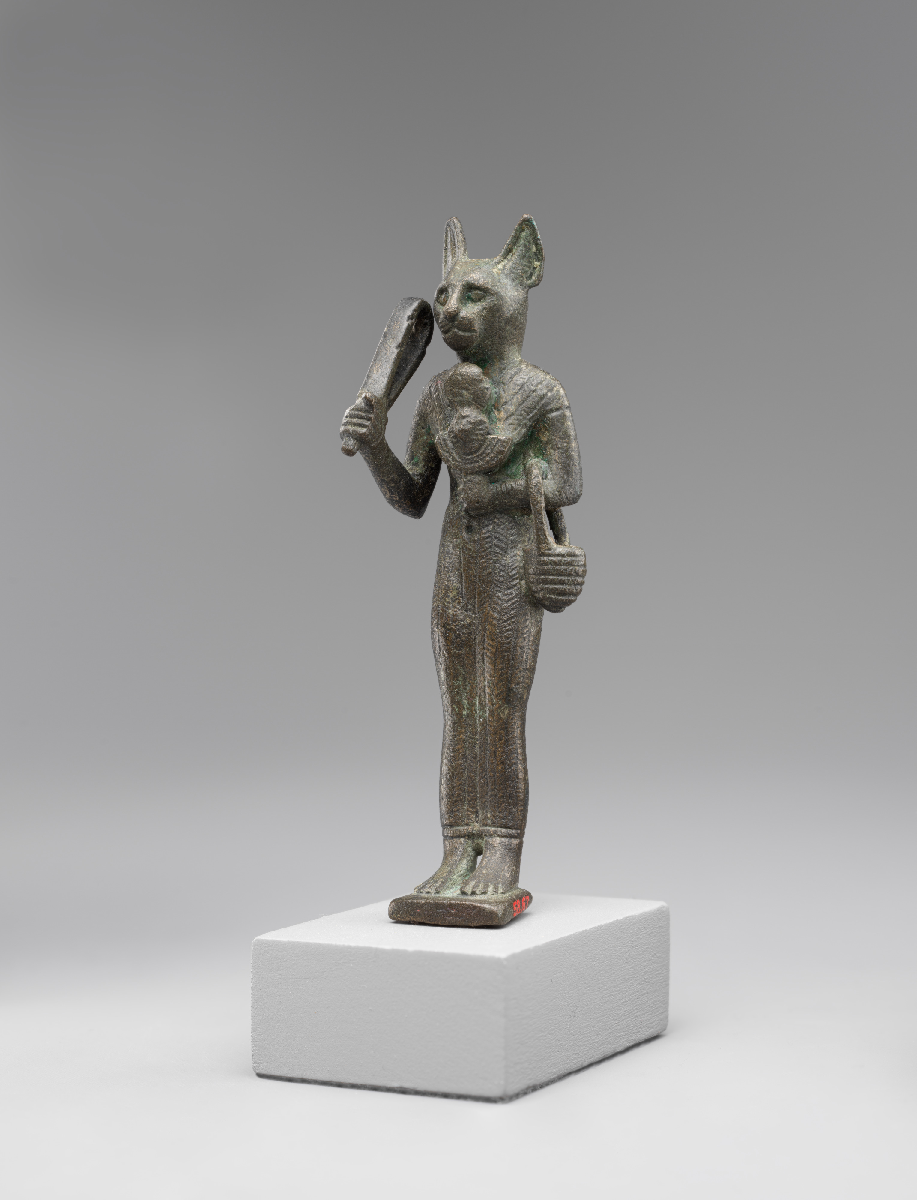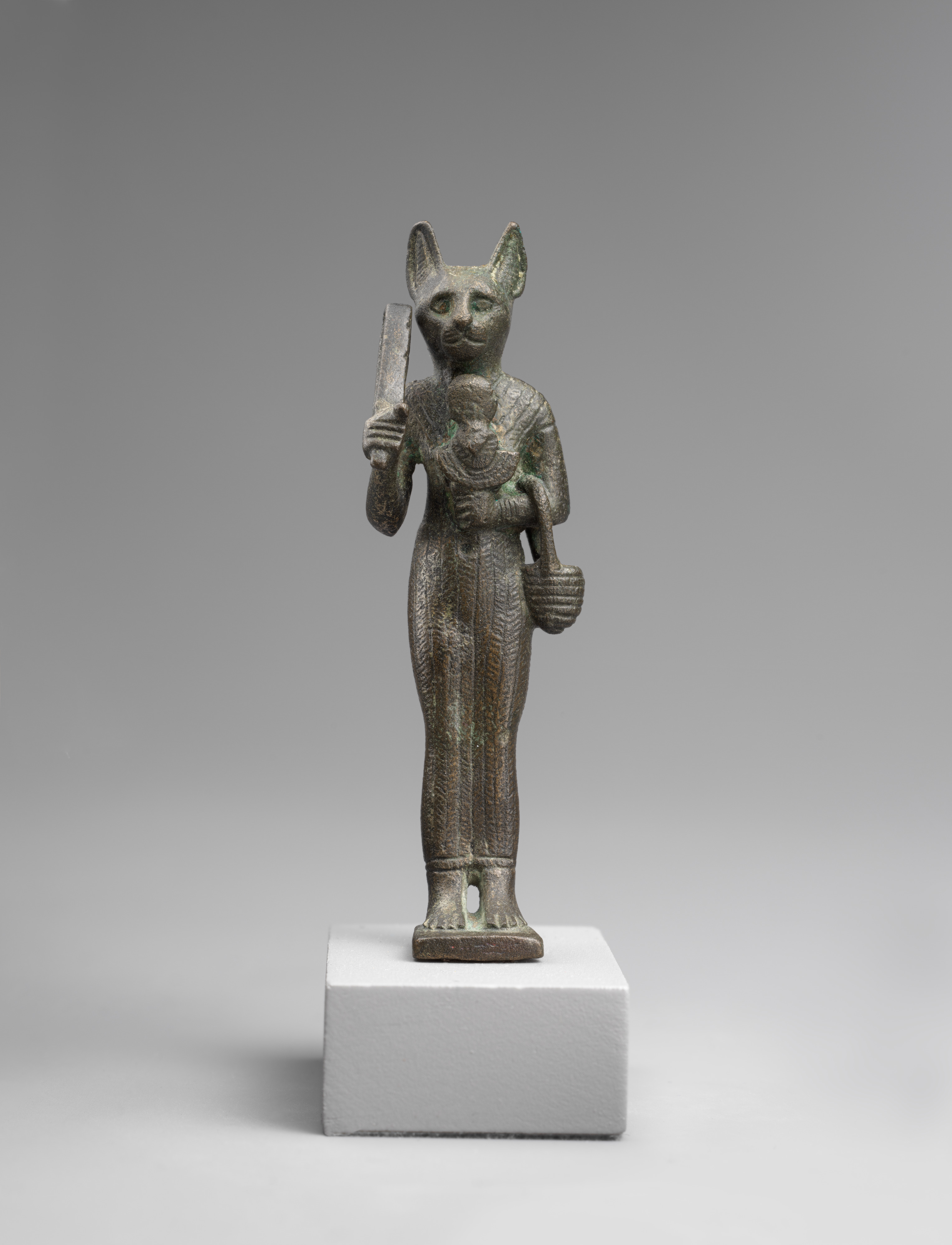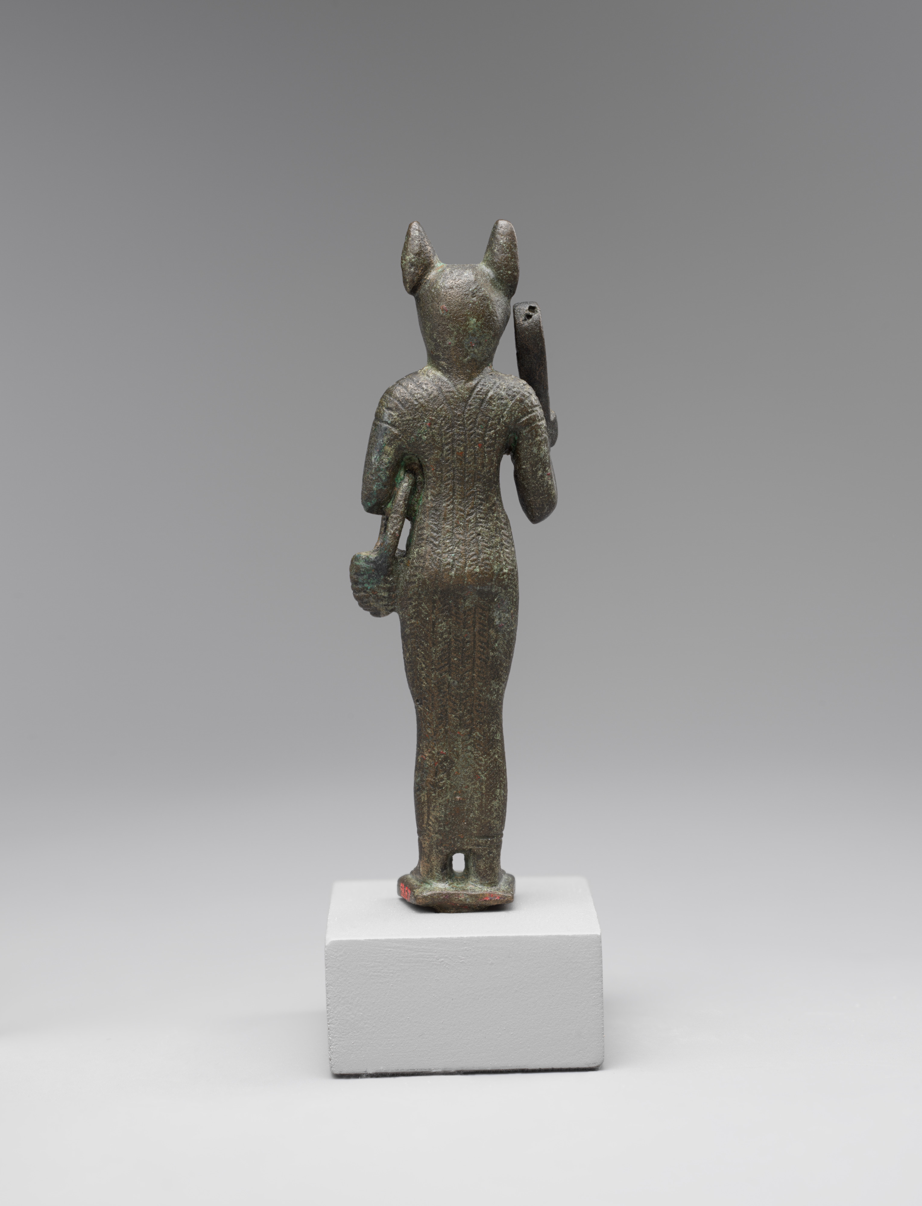 Bastet, here shown as a cat-headed goddess, was a powerful protective figure who also was known for her fertility. She could be represented with a lion head as well, but as a cat-headed goddess her peaceful traits were emphasized. Her personal adornments and garments are elaborate on statuettes, often more so than other goddesses, and she usually carries numerous attributes. This figure holds a banded basket in the crook of her elbow, a protective lion-headed aegis against her chest and a sistrum in her other hand. A suggestion that the basket held kittens seems unfounded, but statuettes of this type do sometimes show the goddess with kittens in front of her, alluding to her fertility. Her dress has a striped herring bone pattern with a defined hem. Bastet does not always wear a decorated dress, but it is much more common for her than for other goddesses. The patterning highlights its intricacy and quality; also, as some have suggested, the vertical banding may recall the striped fur of a cat.