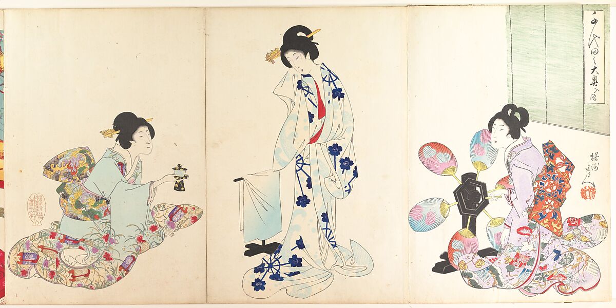 - Medium: Triptych of woodblock prints; ink and color on paper