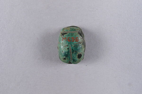 This scarab-shaped amulet with an undecorated base is made of green faience. Green stones and green glazes were often used in the manufacture of amulets: for the ancient Egyptians, the color referred to vegetation and therefore to life, fertility, and renewal.