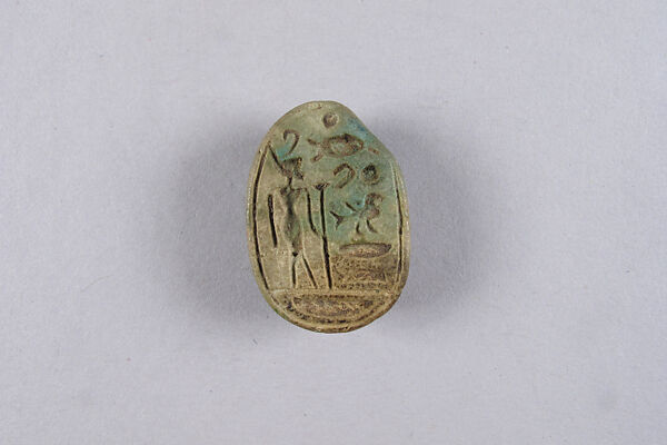The back of the scarab shows no indications for the wings of the beetle, but two small papyrus stems are engraved on the sides.