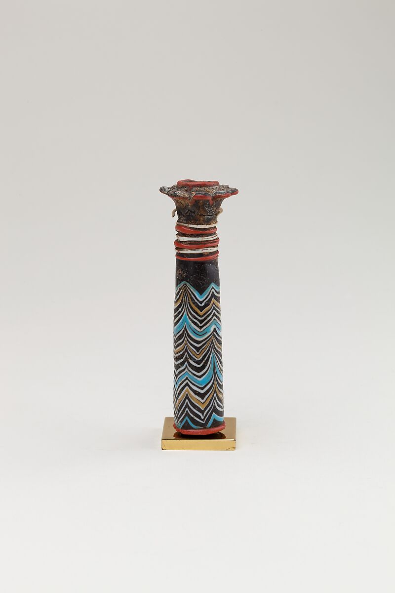 Egyptian glassmaking, which had reached a high level of virtuosity in late Dynasty 18, continued to be practiced in the Ramesside Period; however, the quality, as well as quantity, of it production dropped off sharply in Dynasty 20. The "feathered" decoration of this kohl tube was achieved by winding thin colored glass rods around the vessel and pressing them onto the surface of the vessel while it was still soft, and then drawing the rods up or down with a metal instrument.