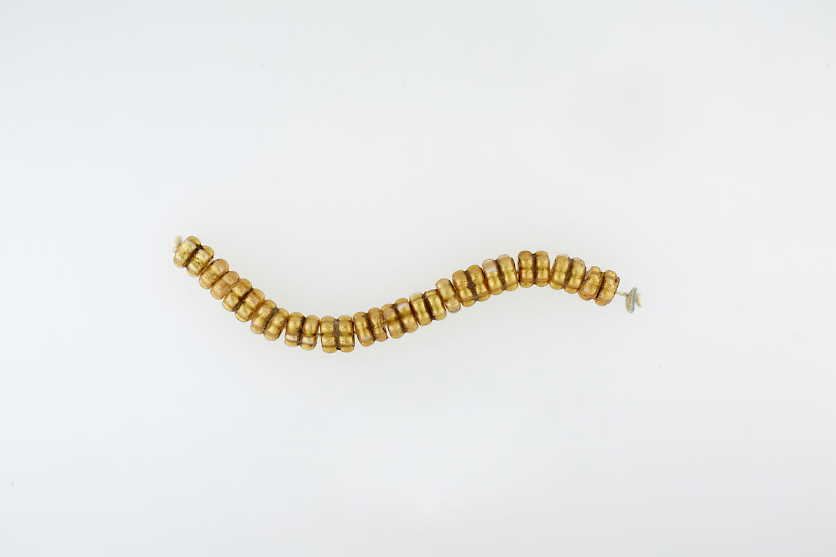 Gold glass beads were a Hellenistic development. They were created by combining drawn tubes of colorless glass with gold foil. The earliest examples were finished bead by bead. These are all modern stringings; most ancient stringing patterns are lost as the string decays.