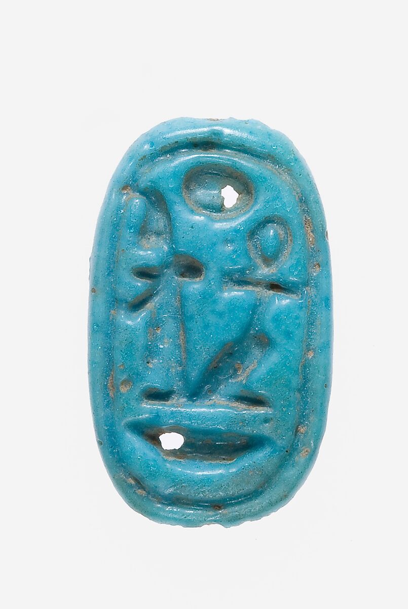 Inscribed on this ring is the throne name of pharaoh Amenhotep III "Nebmaatre" that can be translated as "(The god) Re is the lord of truth," written here with three hieroglyphs. A sun disk for the name of the sun god Re is at the top. In the center is a large depiction of the goddess Maat that is used as a hieroglyph for the concept of truth, as she embodied the principle of world order, truth, and justice. She is depicted squatting and with the sign of life (ankh) on her knees. The ostrich plume that signifies her name is on her head. Other writings for this royal name use the Maat feather alone, but the small figure of the goddess herself might express a more direct and intimate relationship between the king and this goddess. At the very bottom of the bezel is a rounded sign that reads "neb" meaning "lord." Every Egyptian king had five names and four of them, including the throne name that is used here, were chosen when a king ascended the throne. Therefore they often bear a political message that describes the ruler’s program. In this case Amenhotep III associated himself with the sun god as well as with truth and justice.