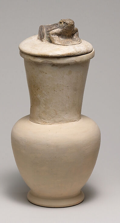 This jar belongs to a set that was purchased in Luxor from Sayed Molattam in 1923. The set is unusual because of the various creatures/deities decorating each lid. These include a frog (this jar); the head of the god Bes, a resting ibex calf, and the head of a bull or calf.