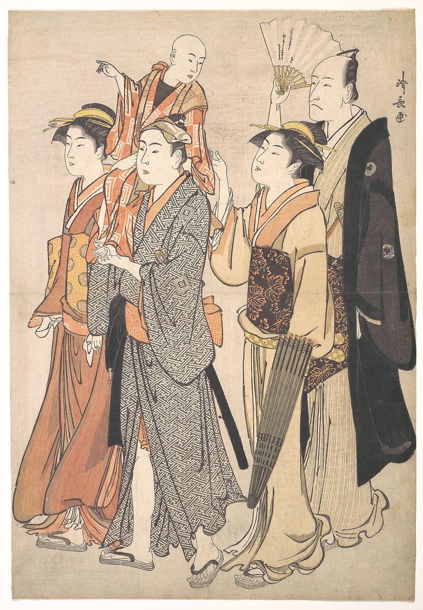 Kiyonaga depicts Danjūrō V and his family on an outing to a shrine. Danjūrō's son Ebizo, the future Danjūrō VI, is carried on the shoulder of Ichikawa Masugoro, Danjūrō's pupil. The characteristic Danjūrō family crest of three nested squares (mimasu) is scattered over the son's kimono; combined with the character go (five), it is superimposed on the ground pattern of Masugoro's kimono. The father wears a formal black jacket with another Danjūrō family crest, one depicting a carp rising in a waterfall..
