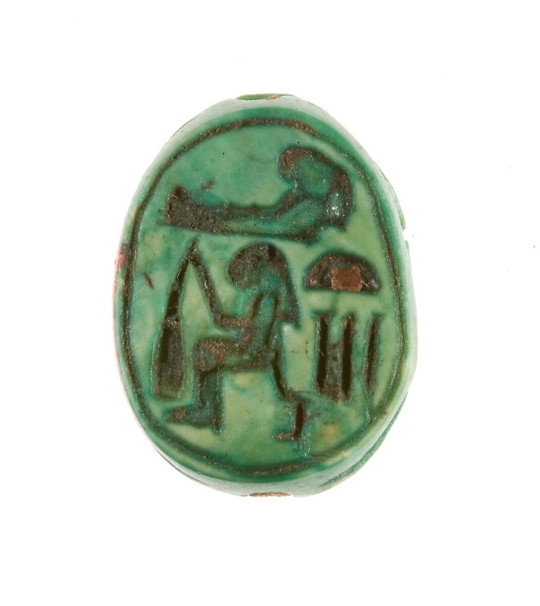 This scarab was found in one of the foundation deposits placed along the front wall of the lower court of Hatshepsut's funerary temple at Deir el-Bahri. The inscription on the base records Hatshepsut's personal name (Hatshepsut), which means "foremost of noblewomen." Two other scarabs from the same foundation deposit have similar versions of the same inscription, though the style is not exactly the same (27.3.169, 27.3.172). The backs of the scarabs are also similar.